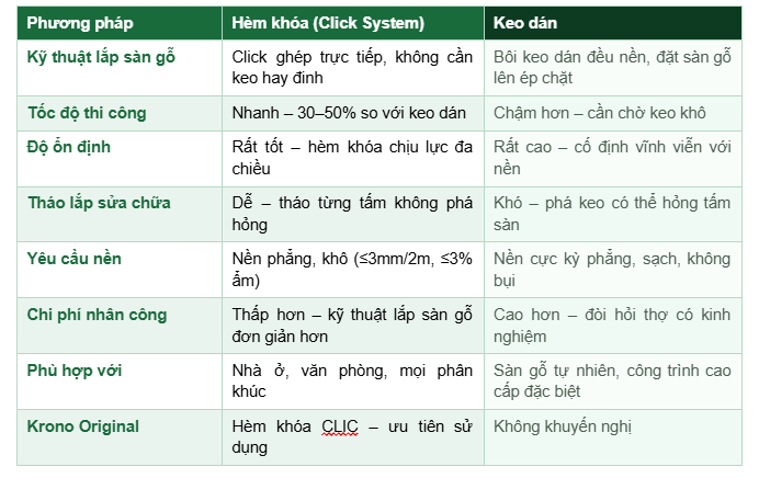 | Sàn gỗ hèm khóa hay keo dán tốt hơn? | Hèm khóa phù hợp 90% công trình: nhanh, dễ sửa chữa, kỹ thuật lắp sàn gỗ đơn giản hơn. Keo dán chỉ dùng cho sàn gỗ tự nhiên hoặc yêu cầu đặc biệt. |