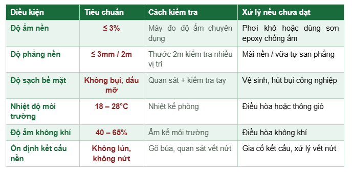 Kỹ thuật lắp sàn gỗ đúng chuẩn – dù bằng hèm khóa hay keo dán – chỉ phát huy hiệu quả khi 6 điều kiện sau được đáp ứng đầy đủ trước khi bắt đầu thi công: