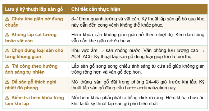| 03 | Kỹ thuật lắp sàn gỗ | Lắp theo hèm khóa từ góc chuẩn · Chừa khe giãn nở 8–10mm · Lắp đúng chiều vân gỗ · Dùng keo dán nếu yêu cầu đặc biệt |